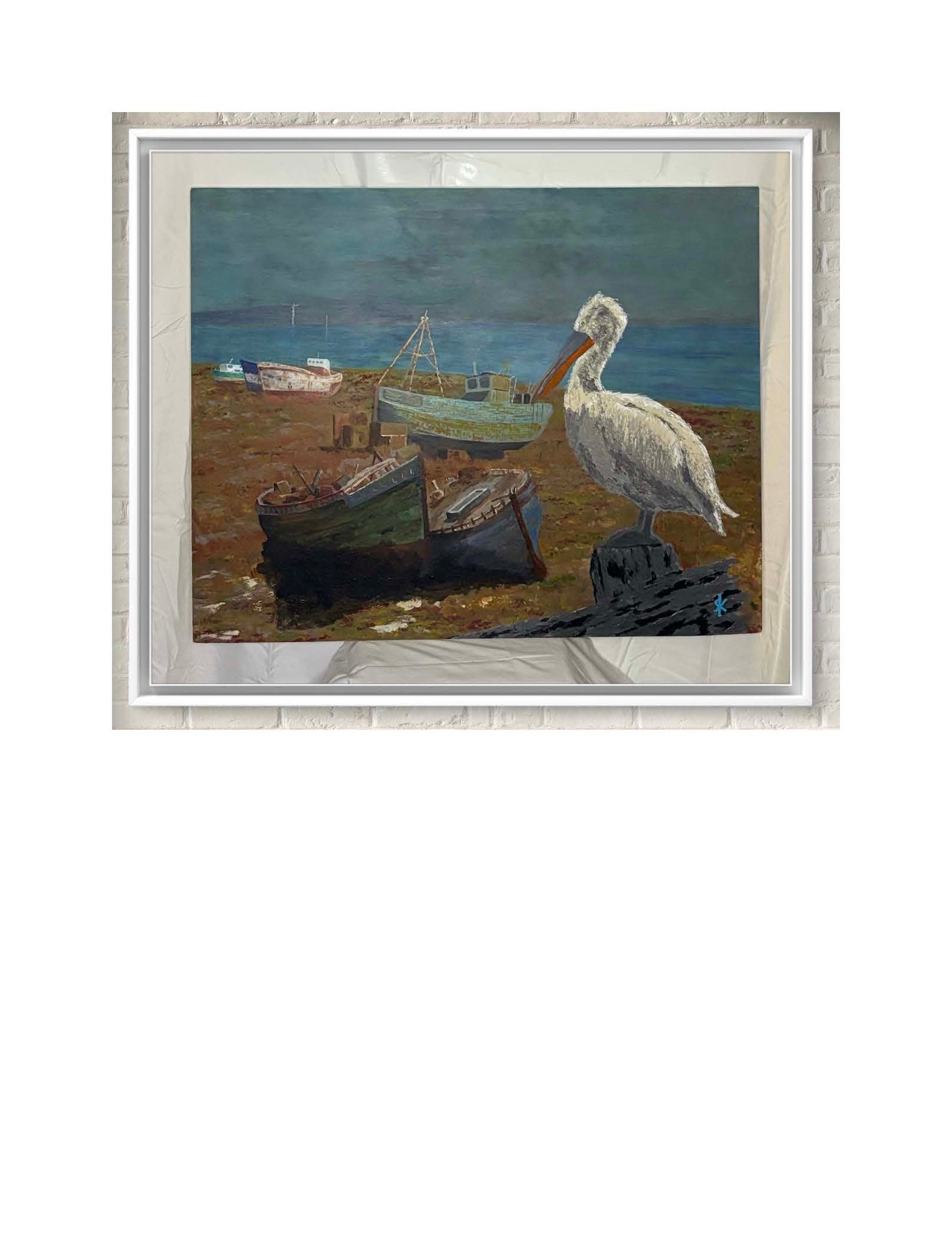 A white pelican surveys the remnants of fishing boats long past their prime. Salt in the air, waves on the beach slowly turn metal to rust, paint to dust and beams to skeletons. With every new tide, change continues.